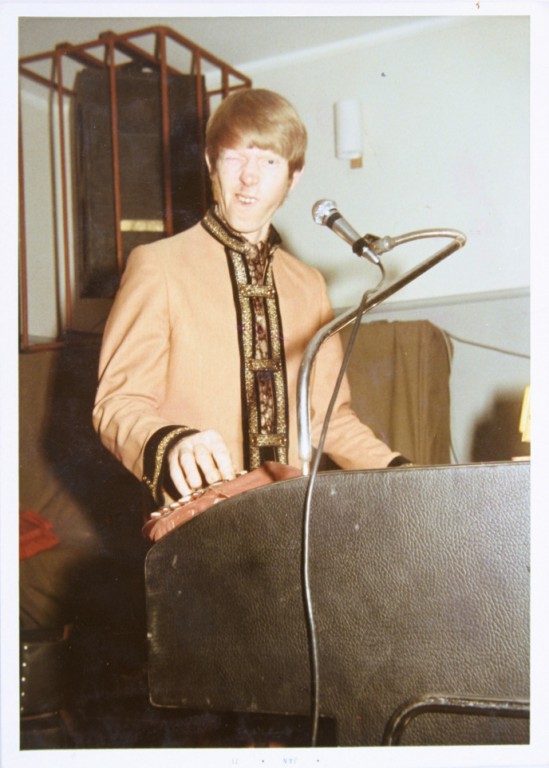 Denna bilden är nog tagen mitt i ett avancerat solo.Här kan man se en skymt av dragspelsklaviaturen som Ingvar byggde på sin Hammond orgel. Längst upp till vänster i bild kan man se en smart lösning på ett Leslye cabinett, lite vågat kanske men det funkade bra på den tiden. |